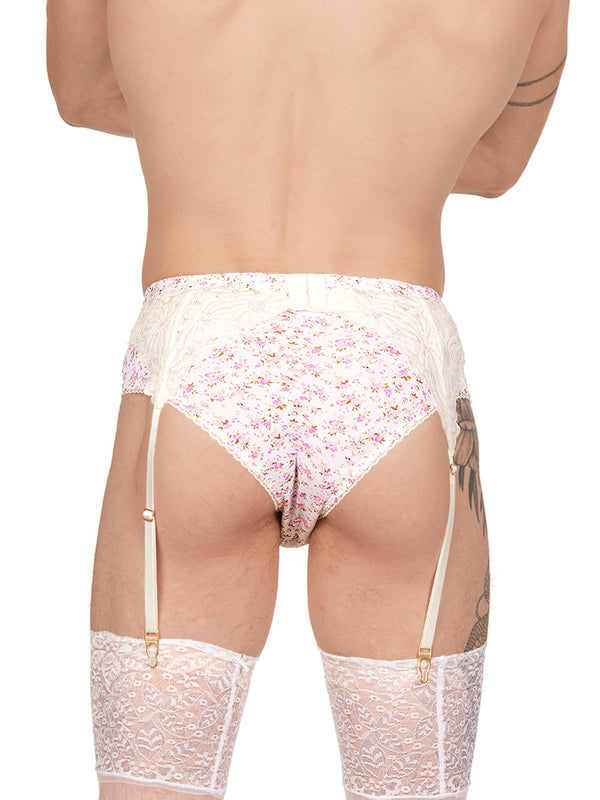 A male model posing outdoors, wearing an XDress floral lace garter belt with delicate white lace trim and an orange blossom print. The garter is paired with a matching men's bra and panty set. Closeup view of a male model wearing an XDress floral lace garter belt with delicate white lace trim and white stockings.