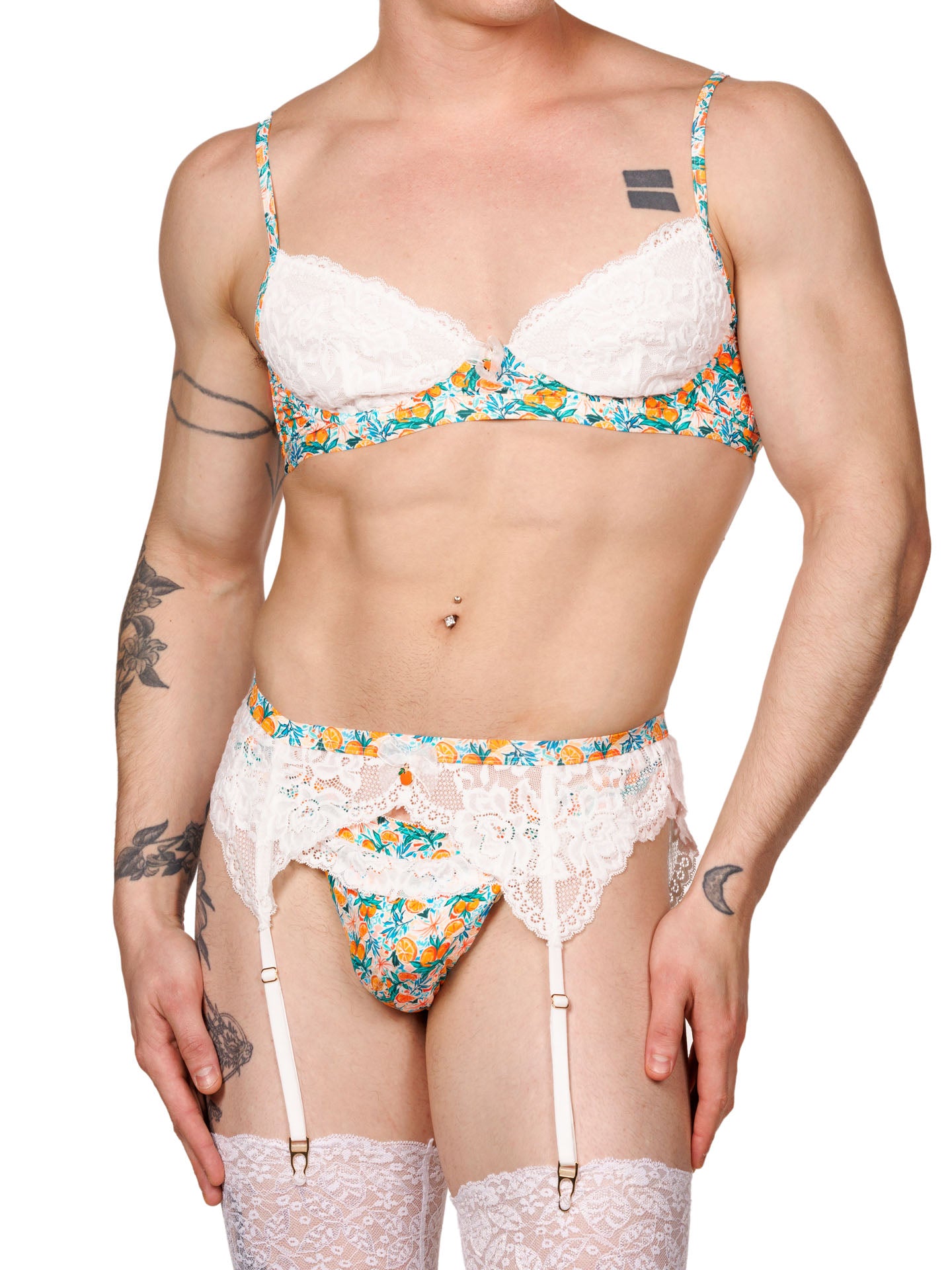 Discover a fresh take on intimate style with this orange blossom lace bra for men, designed to flatter and support. Seamed lace cups, enhanced with supportive underwire and a discreet inner mesh layer, offer exceptional lift and comfort. The dainty bow and metallic charm at the center add a playful flair, while adjustable straps and three hook-and-eye closures at the back ensure a personalized fit. Crafted from a smooth, stretchy fabric, this bra is perfect for all-day wear.